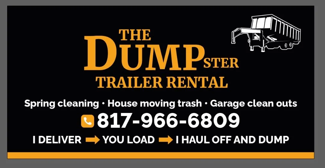The Dump’ster Trailer Rentalcall (817)-966-6809“I deliver, you load , I haul off and Dump.”For All Your Needs* Spring cleaning* House moving trash* Garage junk clean outs* Yard debris , shrubbery, limbs, branches, etc.16.5 yard Dumpster/Trailer—$375.00Includes 1-day rental and up to 1-1/2 tons of trash / junk / debris. Call today to schedule your Dumpster Trailer Rental.817-966-6809Why choose a dumpster/trailer rental over a dumpster? Rubber Tires means less or no damage to yard and or driveway. Serving Burleson and surrounding areas. “We deliver, you load, we haul off to the Dump” Call for pricing, and availability.817-966-6809Small locally owned and operated business. *Offering discounts for nurses,teachers and military. See you soon See you soon See you soon contact→us